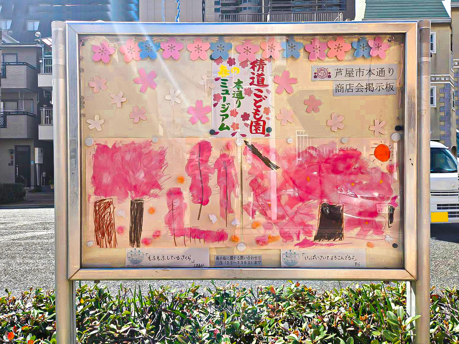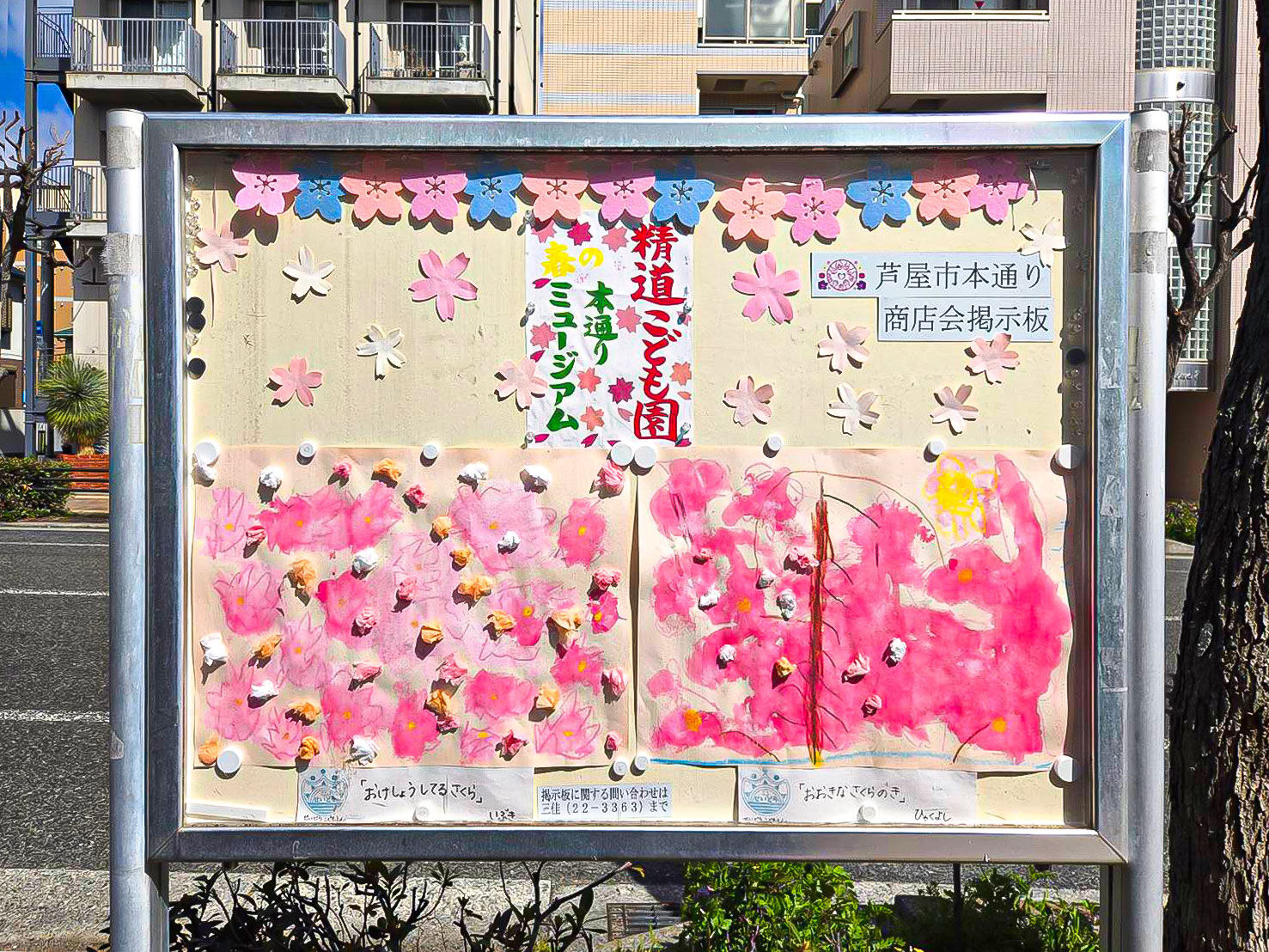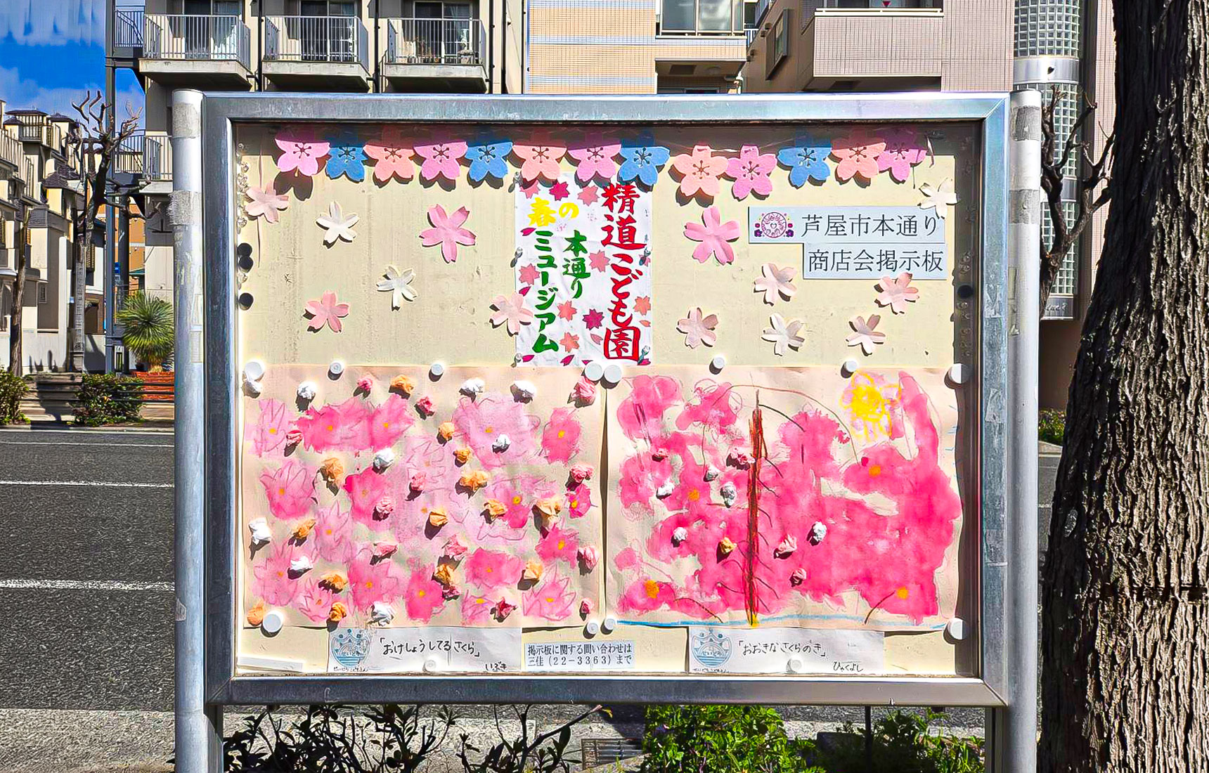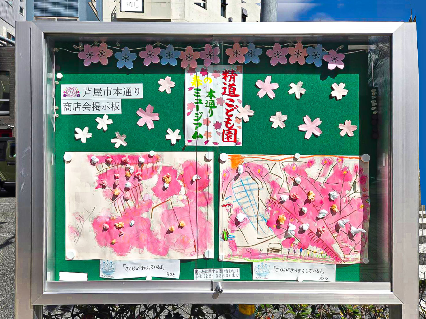現在、本通り商店会では、芦屋市立精道こども園の年中さんが描いてくれた『さくら』の絵を展示しています。これまで桜の木がなかった通りですが、子どもたちの作品のおかげで、パッと春らしく明るい雰囲気になりました。園児のみなさん、本当にありがとうございます!